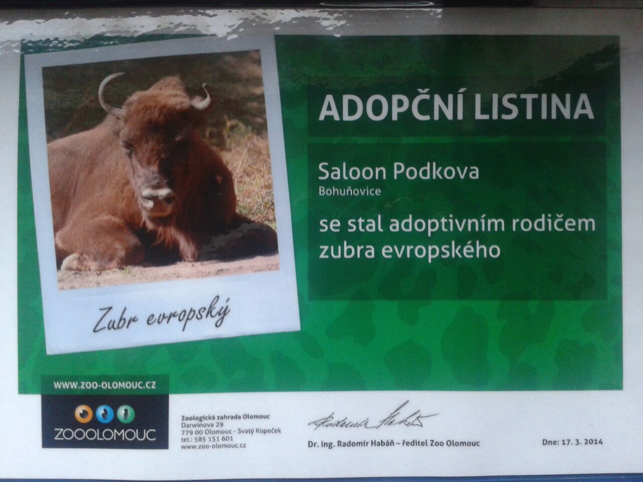 Jsme od otevření pivnice "adoptivními rodiči" Zubra evropského v ZOO Olomouc na Sv. Kopečku.